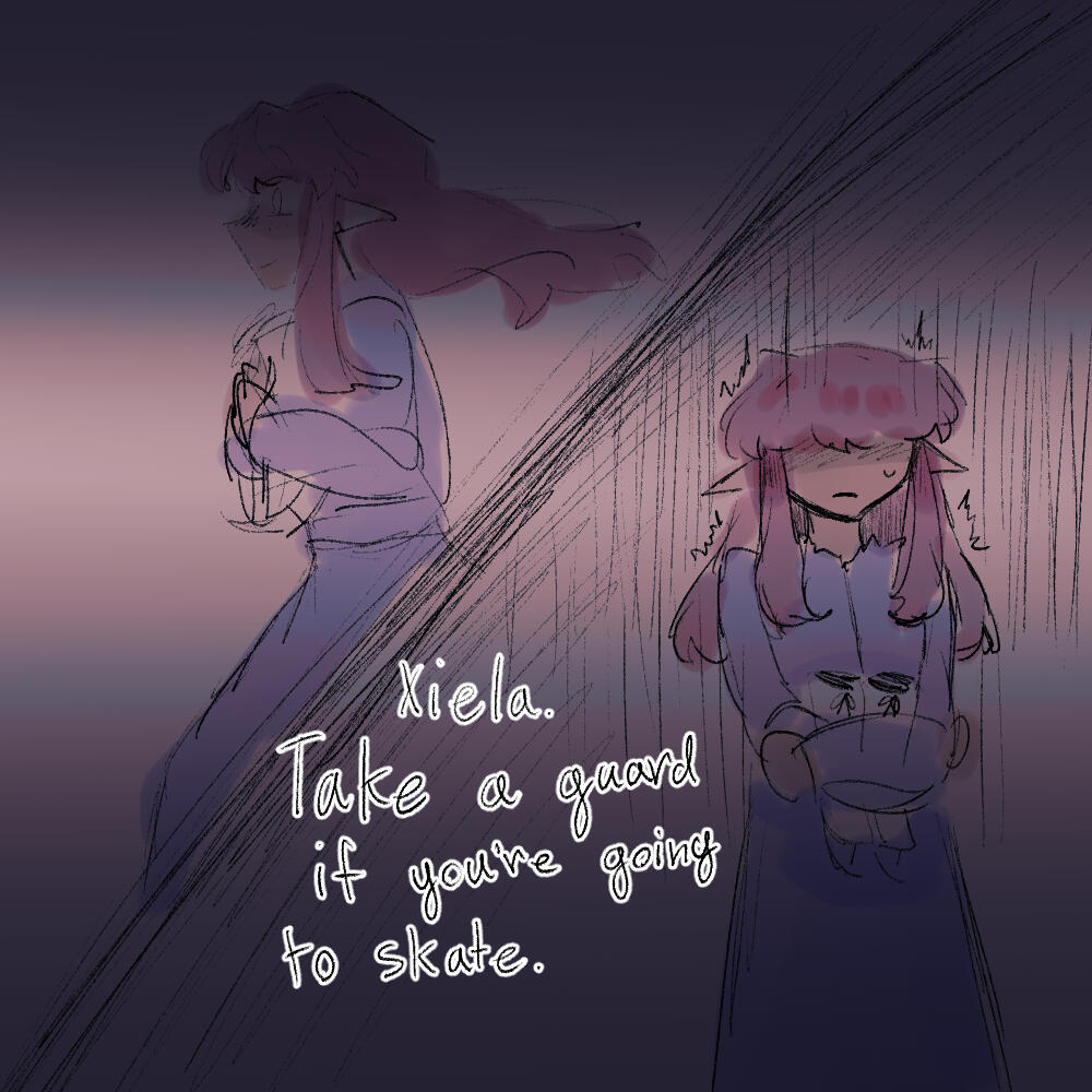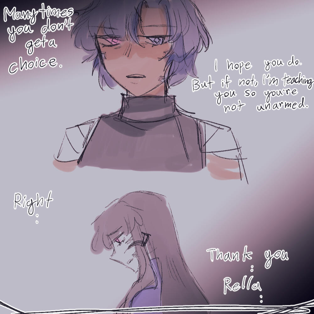 "Watch how your opponent moves closely. I step forward before I attack. When you attack on the right, you leave yourself open on the left."Xiela tried again, watching Rella's steps. As she stepped forward, Xiela was able to dodge her attack. Taking the offense she attacked on the left, Xiela turned her attention to her right. Rella swiftly attacked her from the front, and Xiela found herself on the ground once more."Make sure you're focusing on all angles." Rella offered her hand again.Xiela smacked Rella's hand to the side, rejecting her help.
