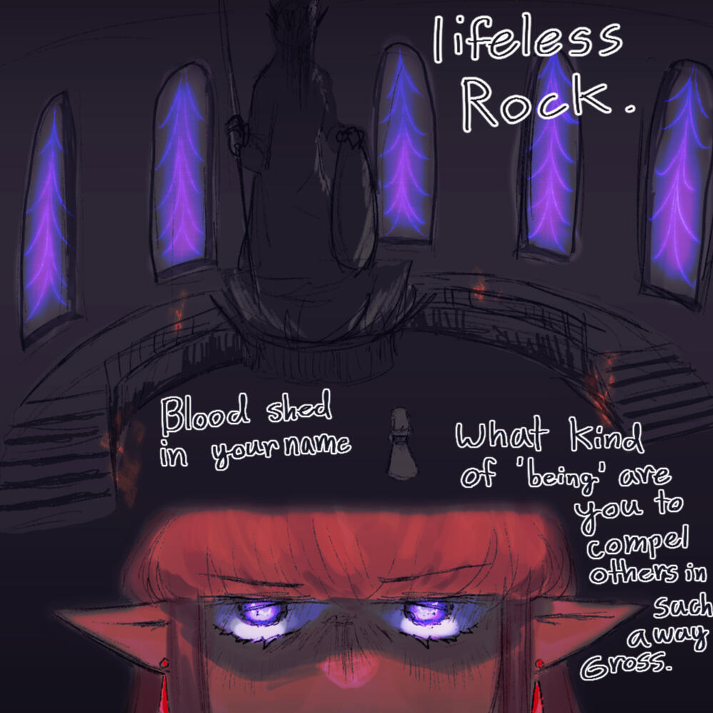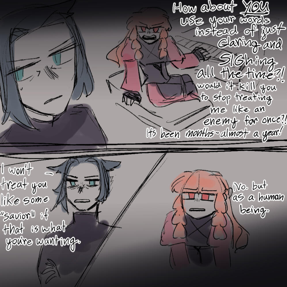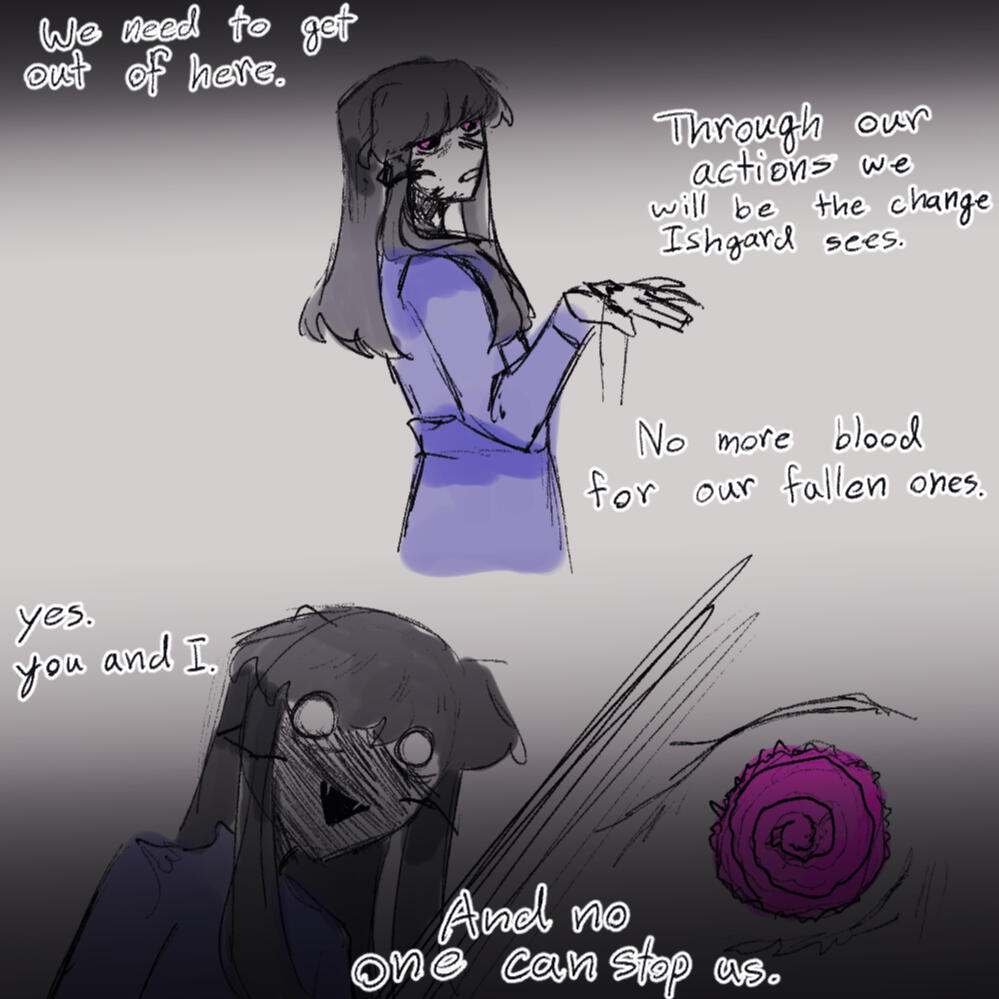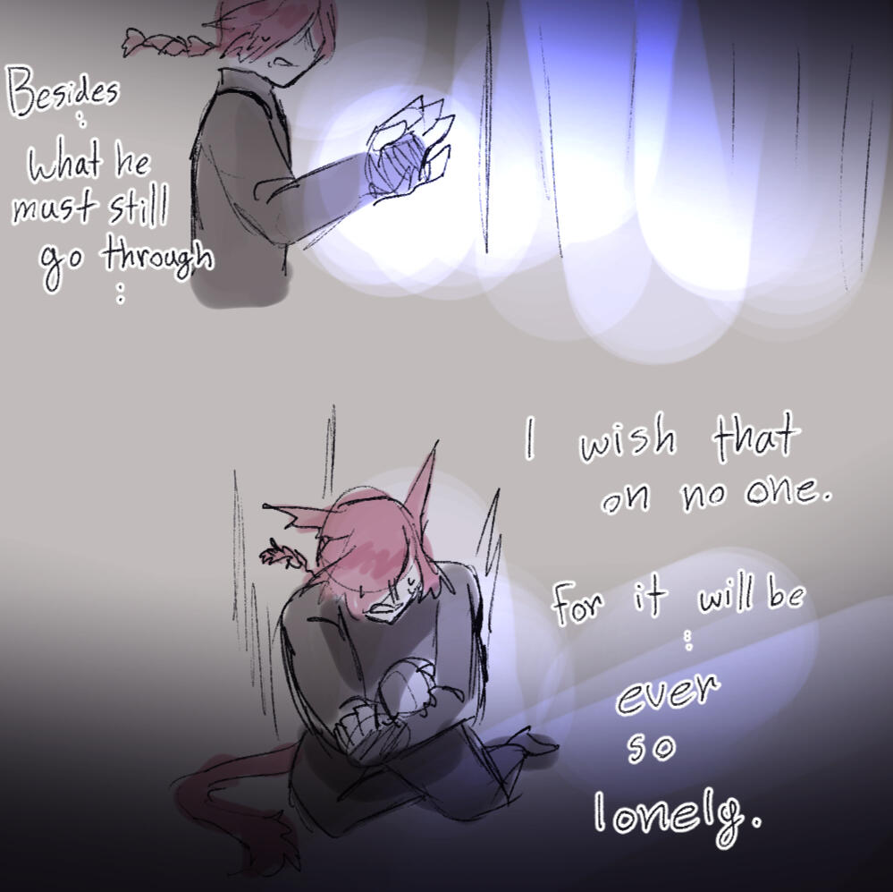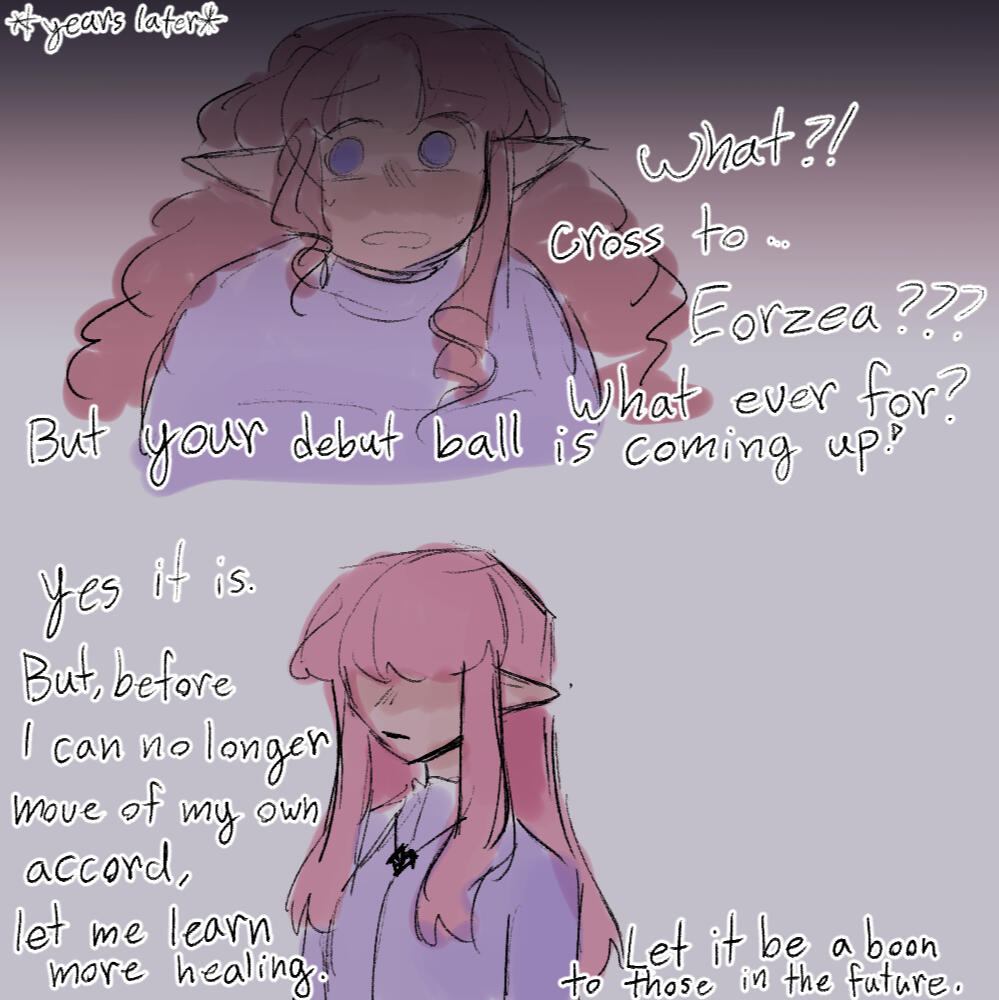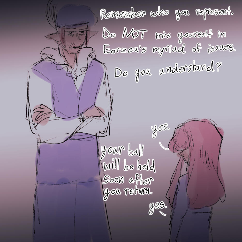 “You always seem to criticize me, rather than help me.” Starting to get back up from the ground readying her next offensive.“I'm trying to help you, Xiela.” Rella's voice still neutral, her demeanor unphased by her aggressive companion.“What about…” swinging another kick and missing, “...in actual battle?! You don't help fight, and now…" Her voice became even more heated, “...you're barely even there!!”“Xiela, you asked me not to assist. I'm tired of watching from the sidelines, and I would rather be somewhere where I can be of use.”“And what? You're just going to listen to whatever I say?""I made a promise to you." Rella said with a slight sadness."You speak of a promise I don't even remember! And for what..?! You leave my fights to be with him? To be with Urianger?! Is he really just your friend? What is he to you, that I'm not?!”“Xiela.” Rella's calm demeanor, turning into irritation. Making it clear in her tone and a sign to Xiela to let it go."You would follow in his lies if Urianger asked you to, wouldn't you?” Xiela yelled.Not a moment passed, Rella said with no hesitation, “I would.““I hate you!! I hate him! I hate everyone in this stupid place!!” Continuing to throw her tantrum like a child who didn't get their way. He was getting all of Rella's attention that Xiela wanted for herself. Rella was reaching her limit with her.Staring daggers, walking closer to Rella, her hand pointing at her accusingly, Xiela threw Rella's warning to the side.“You think you're so much better than me! When actually, you're hiding what you really are! Does he know?!” Xiela kept poking at Rella's emotional wounds to get a reaction.