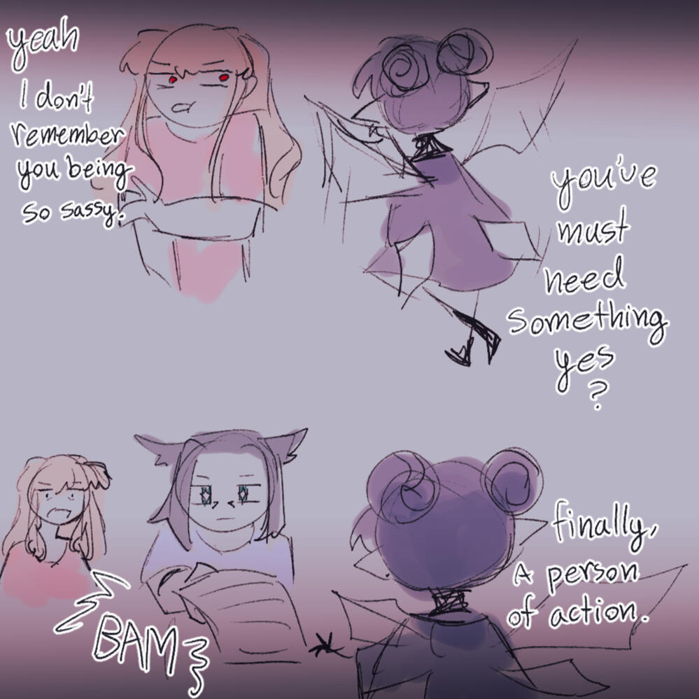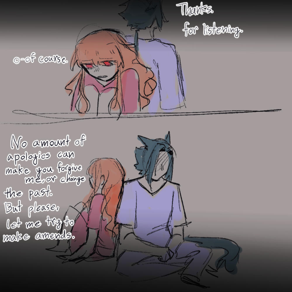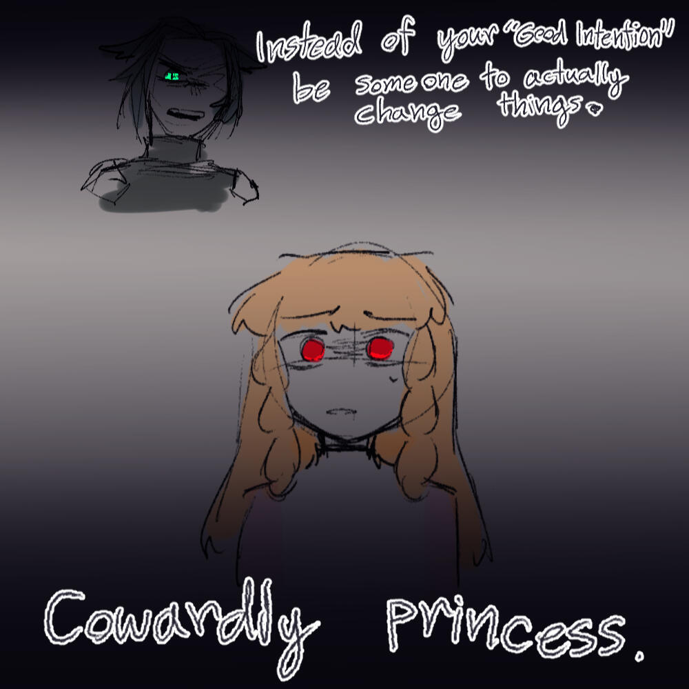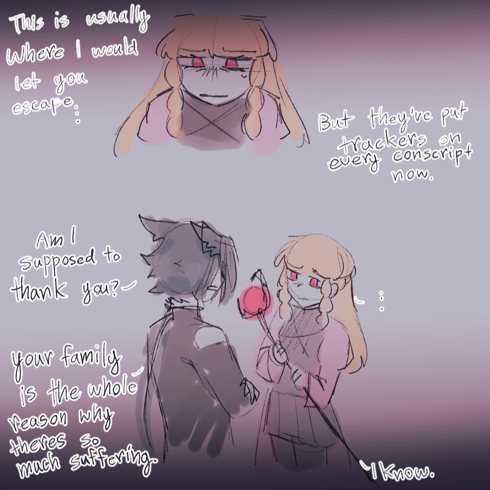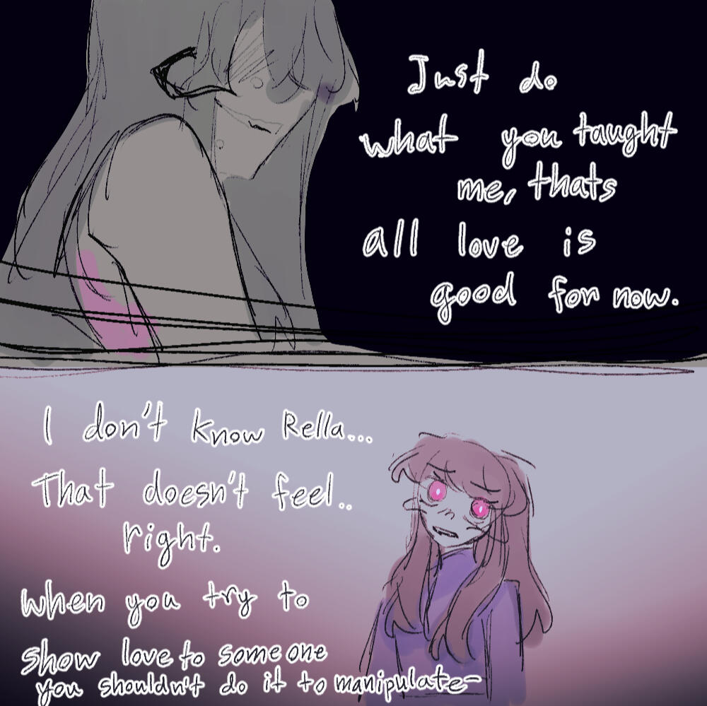 Knocking the wind out of Xiela as she crashed into the wall breaking a good portion of it. Dust scattered across the room as Xiela laid crumpled on the ground. Vision was going in and out, her breath was ragged trying to recover air into her lungs.Within their training, as a mentor Rella was always careful not to ever hurt Xiela. A full force could easily deal heavy damage to a normal person, a clear result in front of the exhausted friend.“Don't speak on things you know NOTHING about!” The tall woman yelled in pain.“I have done nothing but care and sacrifice myself for you!” Shakiness crept into Rella's voice. A stark contrast to the usual stoic nature she wore."When have you cared for me? You treat me like I'm nothing but your servant!""I'm not fearless, and I'm not perfect… I have emotions! There are so many things I regret, with many tears shed along with the pain I've faced… How can I share how I feel when you're too immature to handle your own, and I'm the one busy easing your pain?!" Rella yelled with tears in her eyes."I've put up with you for so long, I've had enough."The dust began to clear, as Rella walked away.Coming to realize that she had spoken so out of line, so cruelly to her best friend, reaching a shaky hand out of the rubble, Xiela tried to look at Rella.“N-no.. wait.. come back.. I'm sorry-.. I'm so sorry..” Only whispers come out of her mouth, the fire and spite long gone, leaving only a poor pathetic soul.Shakily she tried to lift herself off the ground to catch up to Rella to apologize, but unsuccessfully she crumbled under her own weight. Wincing in pain as it shot through all her limbs, screaming at her to stop she didn't want to give in.Long gone were the days where they would spend together, training in secret, them against the world.