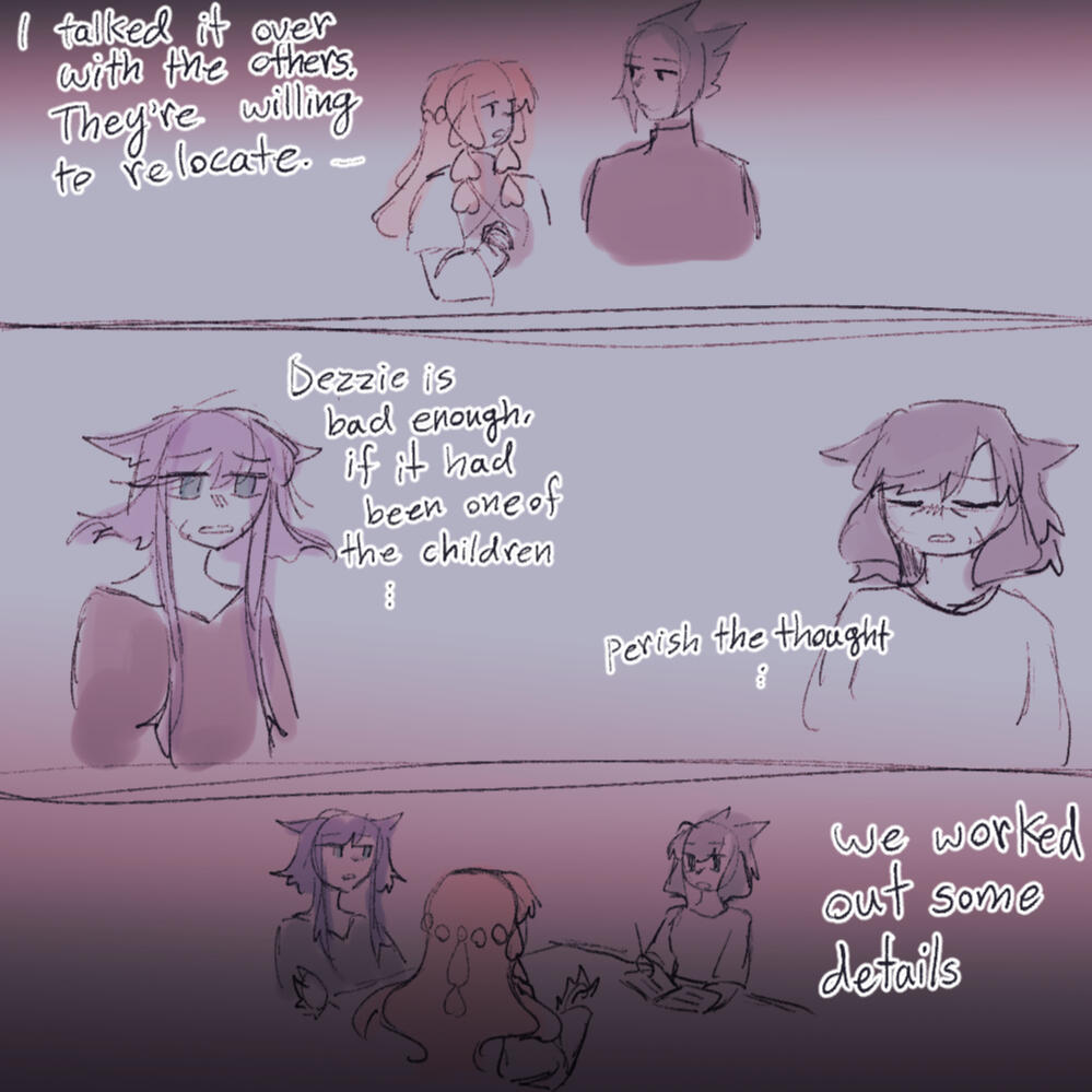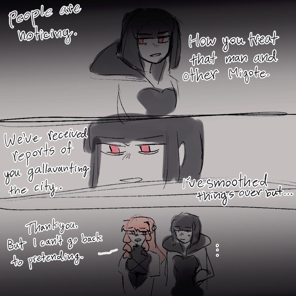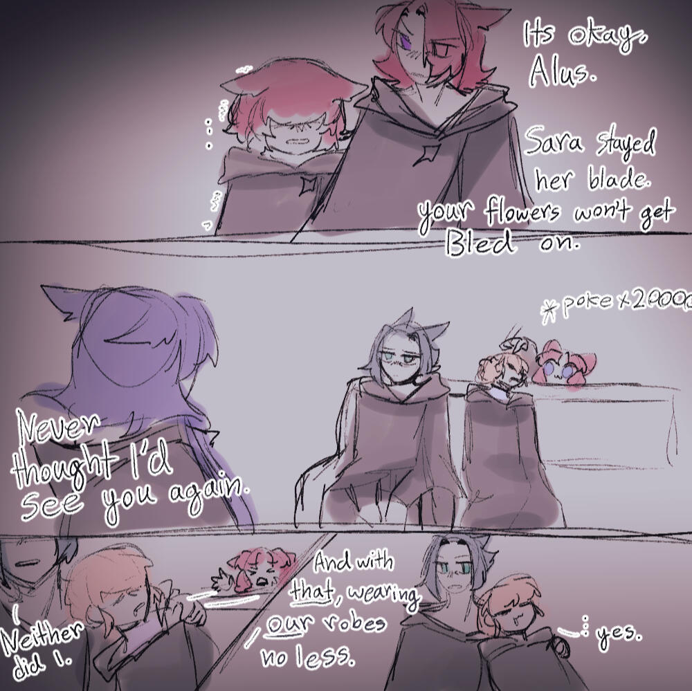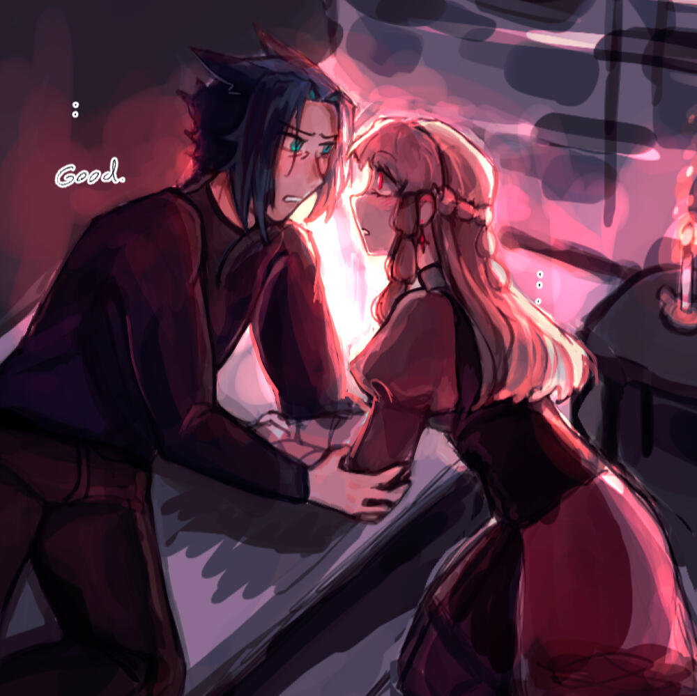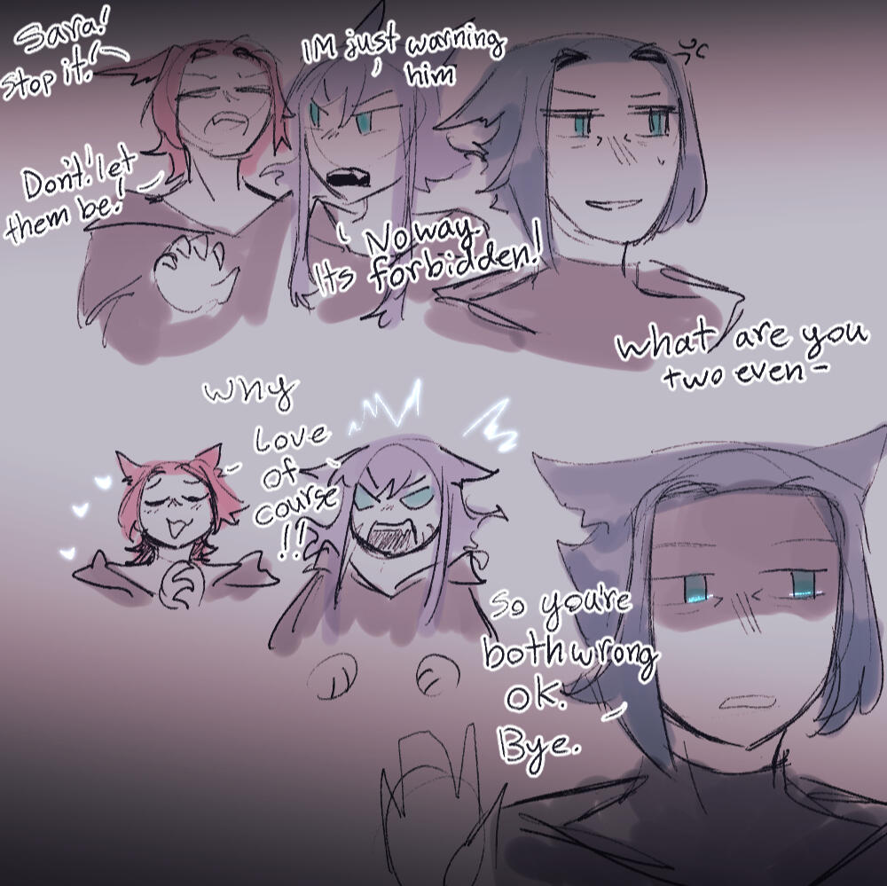 “You always seem to criticize me, rather than help me.” Starting to get back up from the ground readying her next offensive.“I'm trying to help you, Xiela.” Rella's voice still neutral, her demeanor unphased by her aggressive companion.“What about…” swinging another kick and missing, “...in actual battle?! You don't help fight, and now…" Her voice became even more heated, “...you're barely even there!!”“Xiela, you asked me not to assist. I'm tired of watching from the sidelines, and I would rather be somewhere where I can be of use.”“And what? You're just going to listen to whatever I say?""I made a promise to you." Rella said with a slight sadness."You speak of a promise I don't even remember! And for what..?! You leave my fights to be with him? To be with Urianger?! Is he really just your friend? What is he to you, that I'm not?!”“Xiela.” Rella's calm demeanor, turning into irritation. Making it clear in her tone and a sign to Xiela to let it go."You would follow in his lies if Urianger asked you to, wouldn't you?” Xiela yelled.Not a moment passed, Rella said with no hesitation, “I would.““I hate you!! I hate him! I hate everyone in this stupid place!!” Continuing to throw her tantrum like a child who didn't get their way. He was getting all of Rella's attention that Xiela wanted for herself. Rella was reaching her limit with her.Staring daggers, walking closer to Rella, her hand pointing at her accusingly, Xiela threw Rella's warning to the side.“You think you're so much better than me! When actually, you're hiding what you really are! Does he know?!” Xiela kept poking at Rella's emotional wounds to get a reaction.