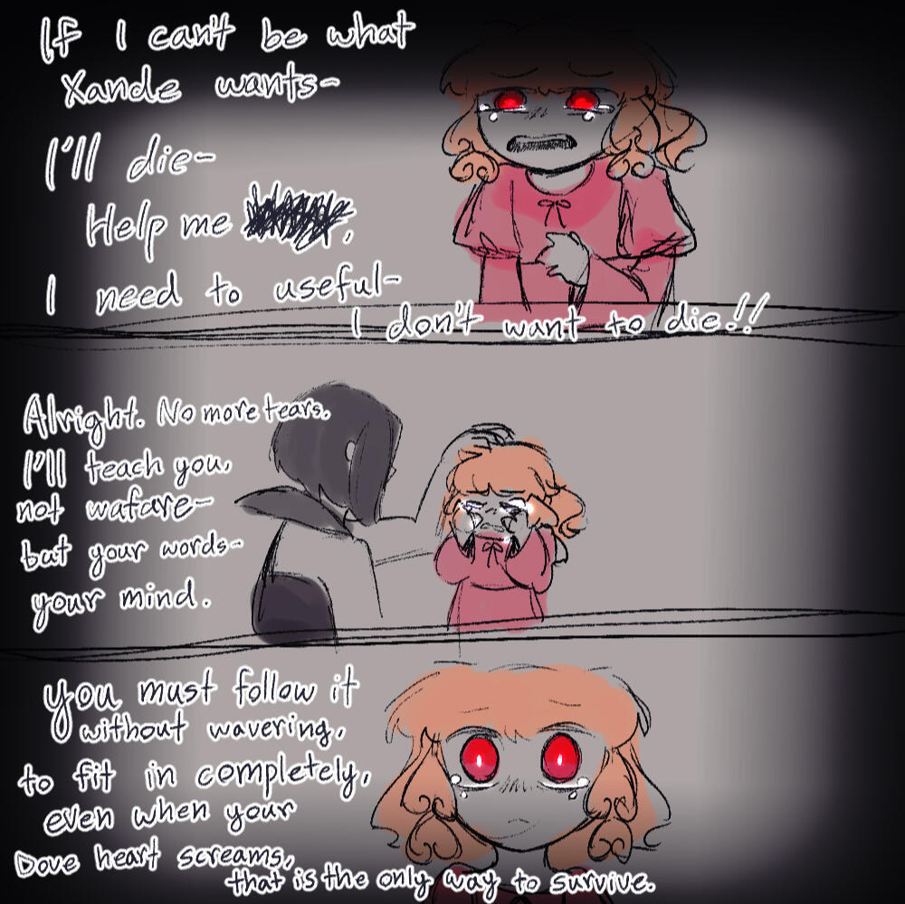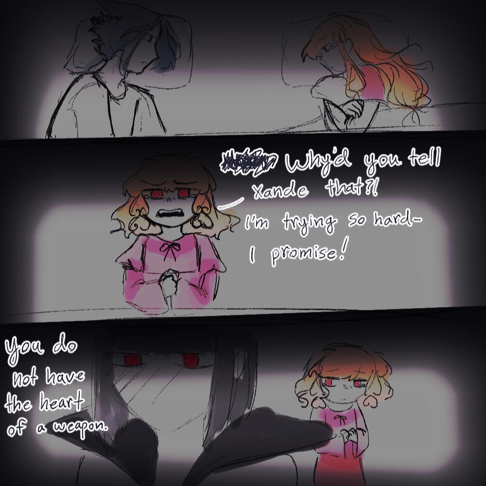 Xiela's voice dropped low, her tone becoming even and calculating. Her aim was to hurt.“If you're so fearless, she would still be here.”Shoving Xiela back, to have some space in between them Rella's eyes shot back anger and resentment